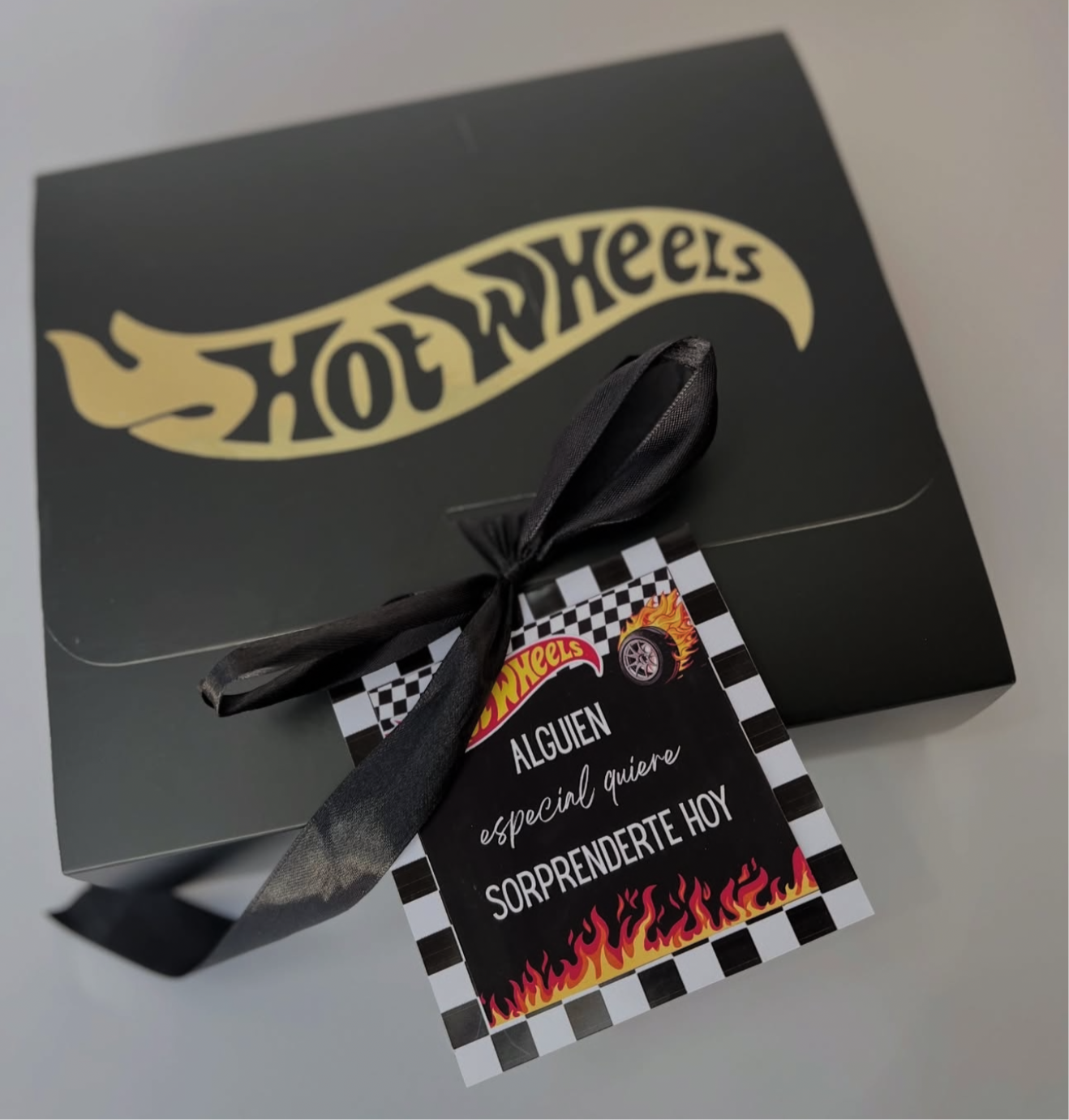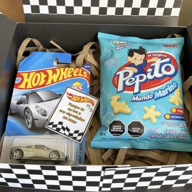 Incluye caja decorada, carrito hot wheels, snack y un chocolate