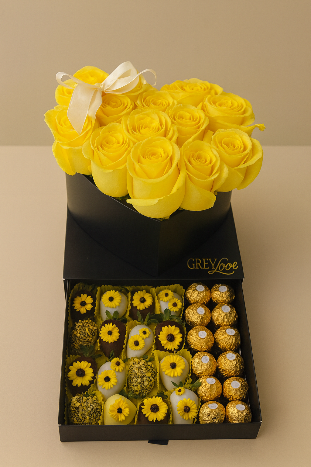 Incluye 15 rosas, 12 fresas cubiertas de chocolate y 12 ferrero rocher. La caja abre y cierra, completamente de lujo. También incluye tarjeta para dedicatoria